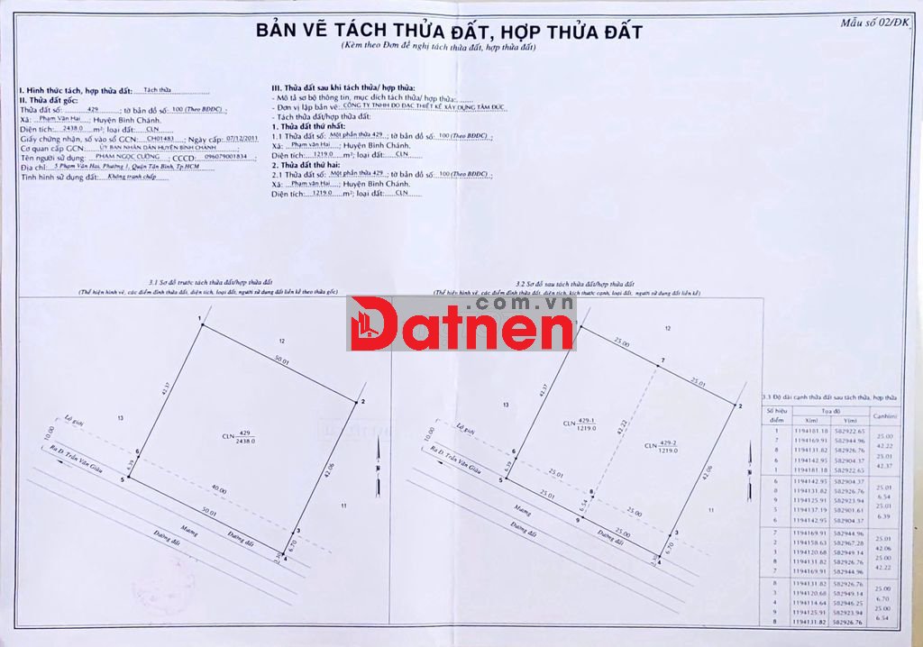 Miễn môi giới, QC, đăng tin, cảm ơn. Chính chủ tổng diện tích 50x48m (2.438m2) đất vuông vắn MT 50m, QH đất dân cư xây dựng mới 1/đường xe tải 6T LG10m vào KCN An Hạ trải nhựa kết nối lên đường Vành Đai 3 và Võ Văn Kiệt nối dài, cách Tỉnh Lộ 10 khoảng 500m, Ấp 5, X.Phạm Văn Hai, Bình Chánh, TP. HCM, 7.5T/m2. Đã tách đôi thành 2 sổ có thể bán nữa.