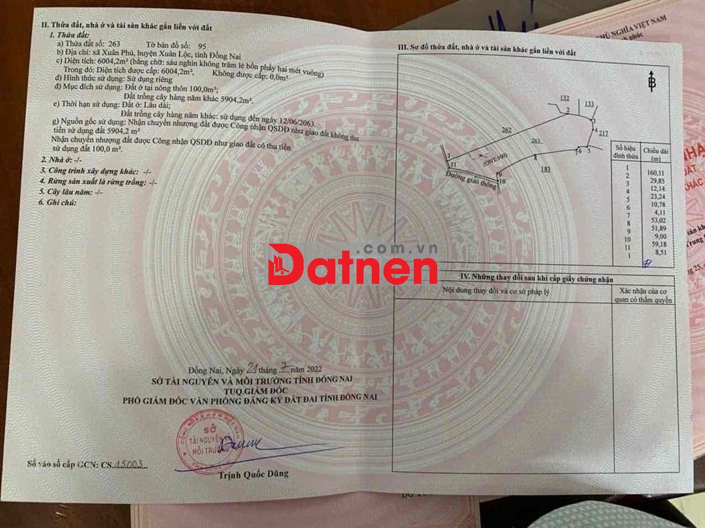 • Vị trí: Tờ bản đồ số 95, thửa 263. Thế đất đẹp, vuông vắn, có đường giao thông hiển thị trên sổ.