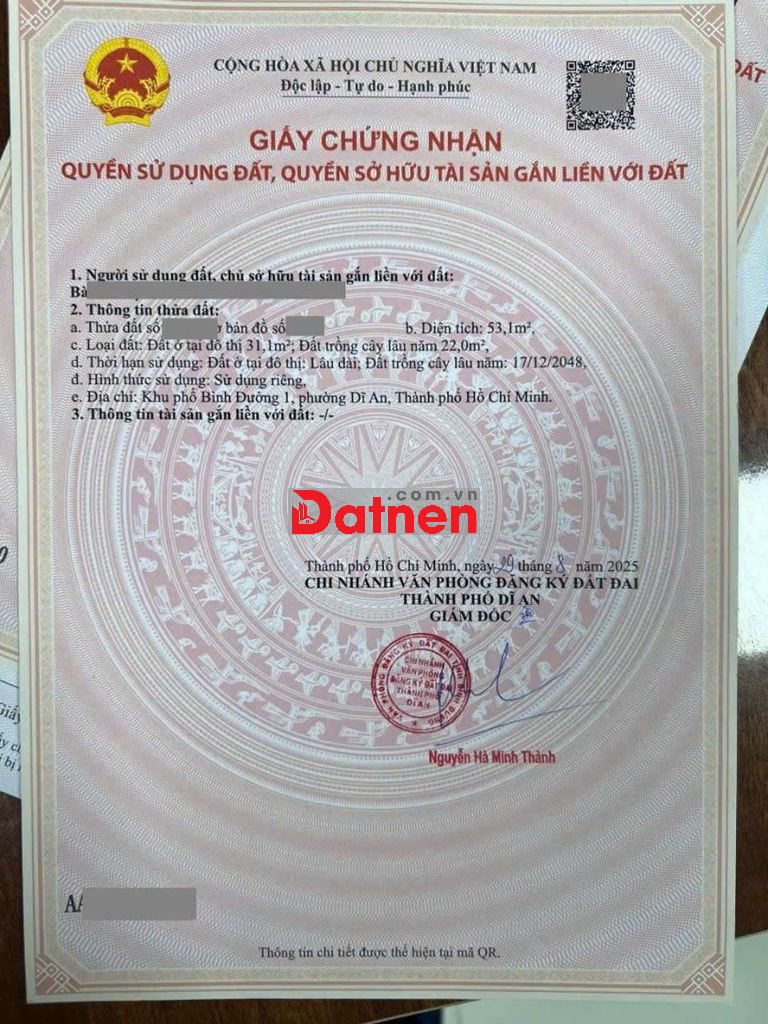 Vị trí: Đường Nguyễn Tri Phương vào 100m, kế bên chợ Dĩ An 2, gần trung tâm hành chính Dĩ An và Thủ Đức, đường xe oto đi lại thuận tiện. Xây dựng tự do.