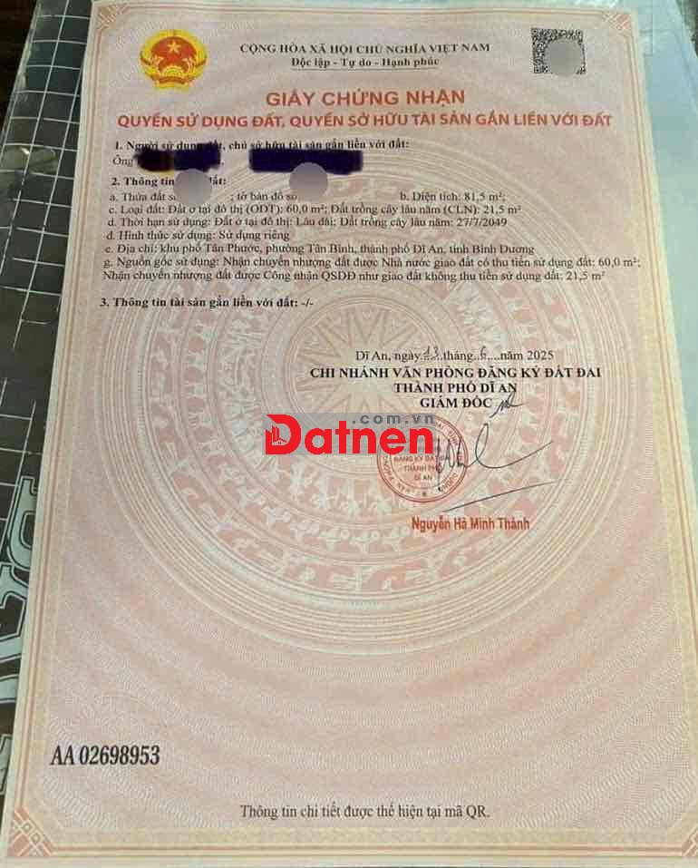 Đất 81,5m(ngang 5m) ,gần trường cấp 2 Tân Bình,TP Dĩ An
